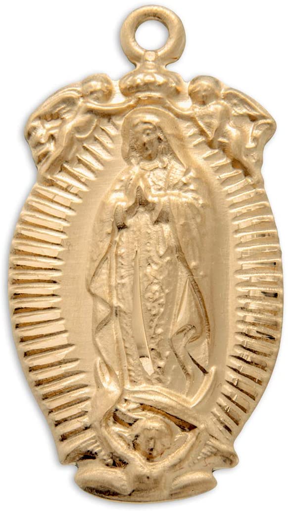 Our Lady of Guadalupe medal-pendant. 16kt Gold over solid sterling silver. Medal is die struck. Hand polished and engraved by New England Silversmiths.Dimensions: 1.2" x 0.6" (31mm x 16mm) 18" Genuine gold plated curb chain. Weight of medal: 5.7 Grams. Made in USA. Deluxe velvet gift box.