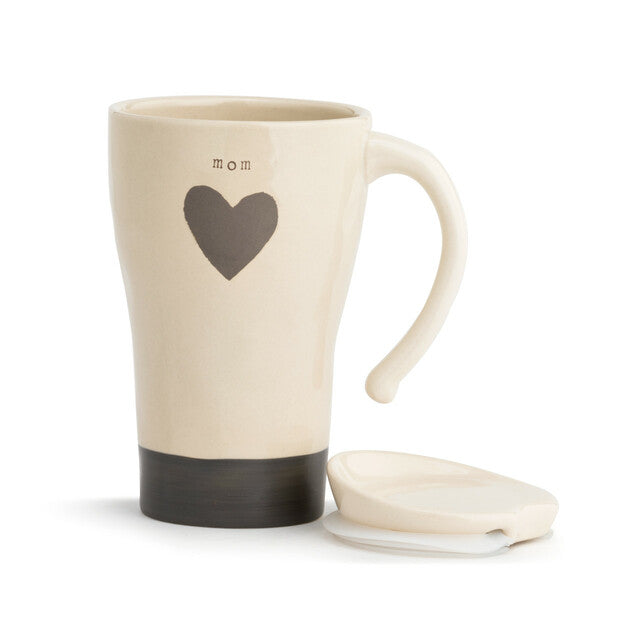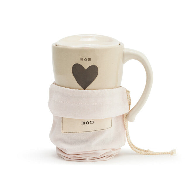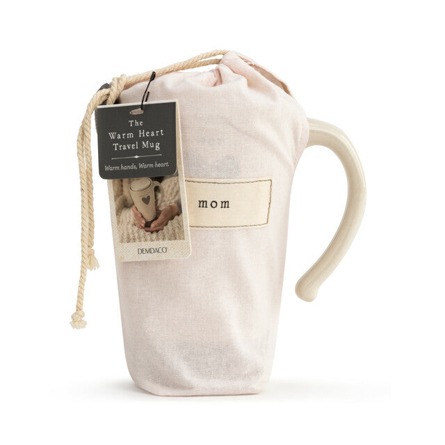 The warmest gift you can give a loved one is one of our Warm Heart travel mugs. Our Mom Heart Travel Mug is a hand-thrown ceramic, on-the-go mug that will fit naturally in her hands. It is textured, so she will have a secure grip on her coffee or other hot beverage. The cream body and dark gray base will suit anyone's taste, and the dark gray colored heart with the name, "Mom," written above it makes this gift an expression of love. The lid of this mug is also ceramic with a rubber seal for protection from spills. Give this unique travel mug as a Mother's Day, birthday, holiday or anytime gift. You can pair it with other coffee or tea related gifts or our matching cozies. It comes with a cotton gift bag, for wrapping the mug or adding other goodies.