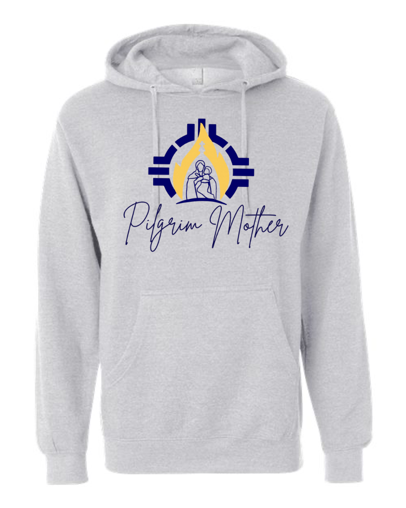 • Design: "Pilgrim Mother" emblem with Marian shrine outline and script typography