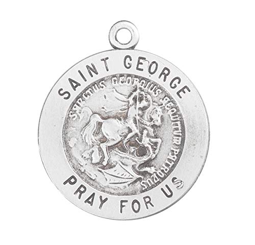Saint George round medal-pendant. Solid .925 sterling silver. Detail depicts him on a horse spearing a dragon. Saint George is the Patron Saint of Boy Scouts, and Cavalrymen. Medal is die struck. Hand polished and engraved by New England Silversmiths. Dimensions: